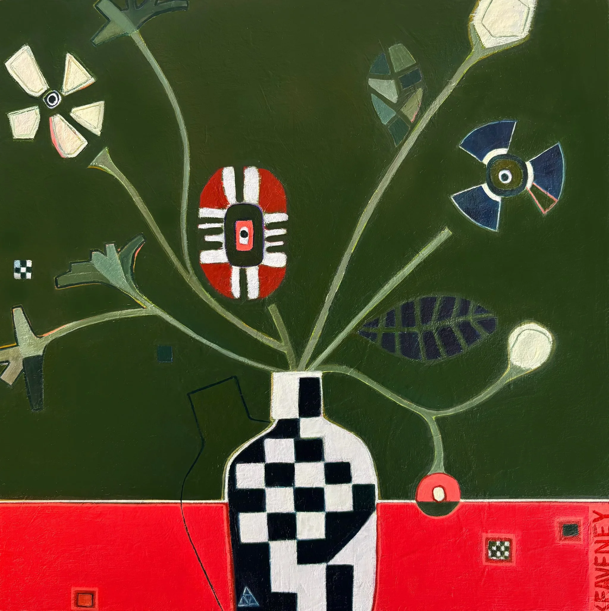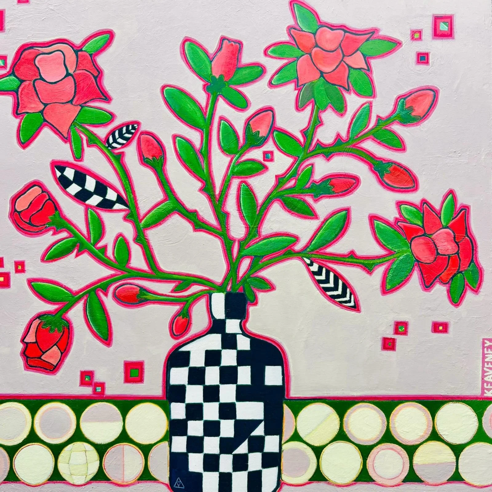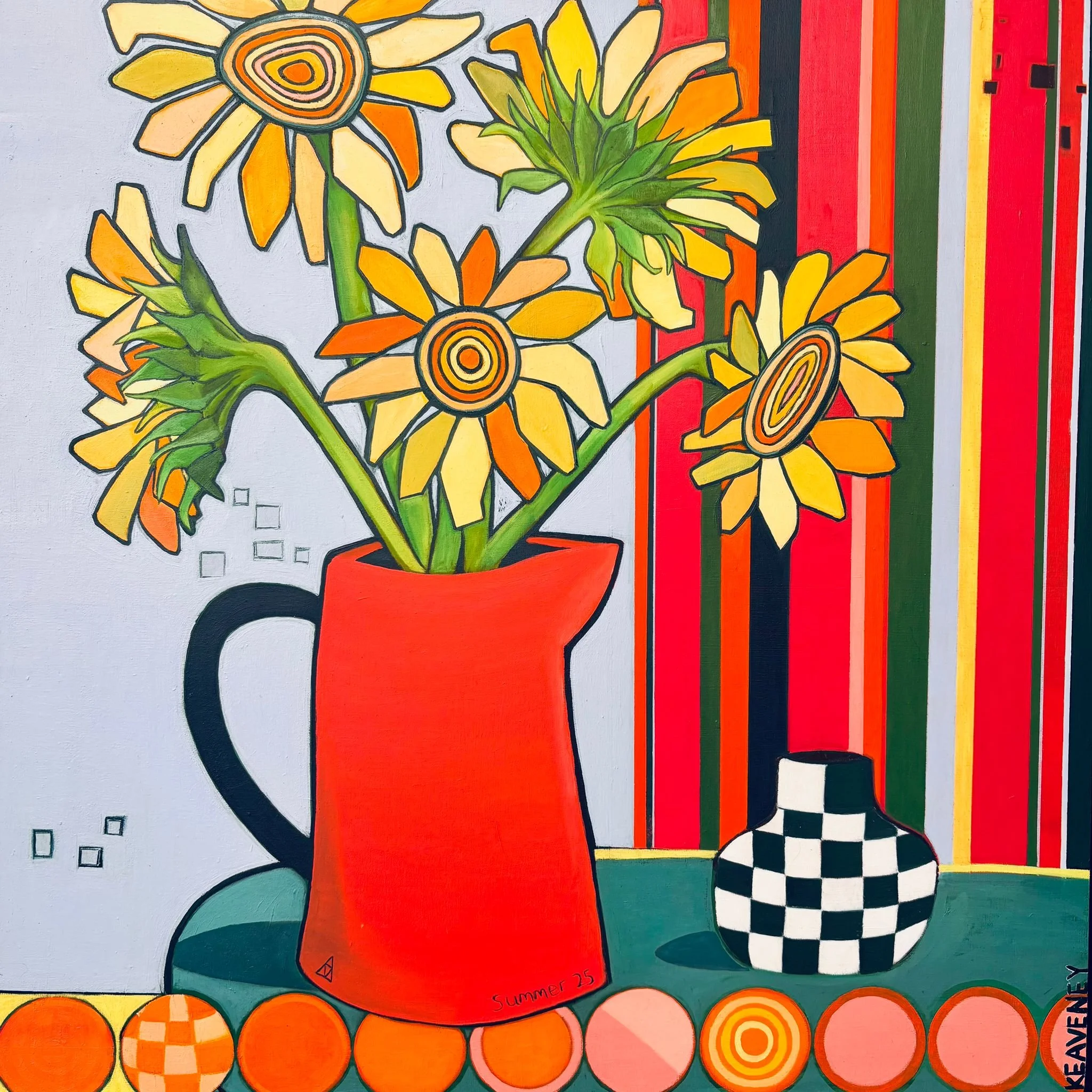 My painting practice explores bold colour, pattern, recurring motifs, vessels and geometry, translating my inner world into visual form.