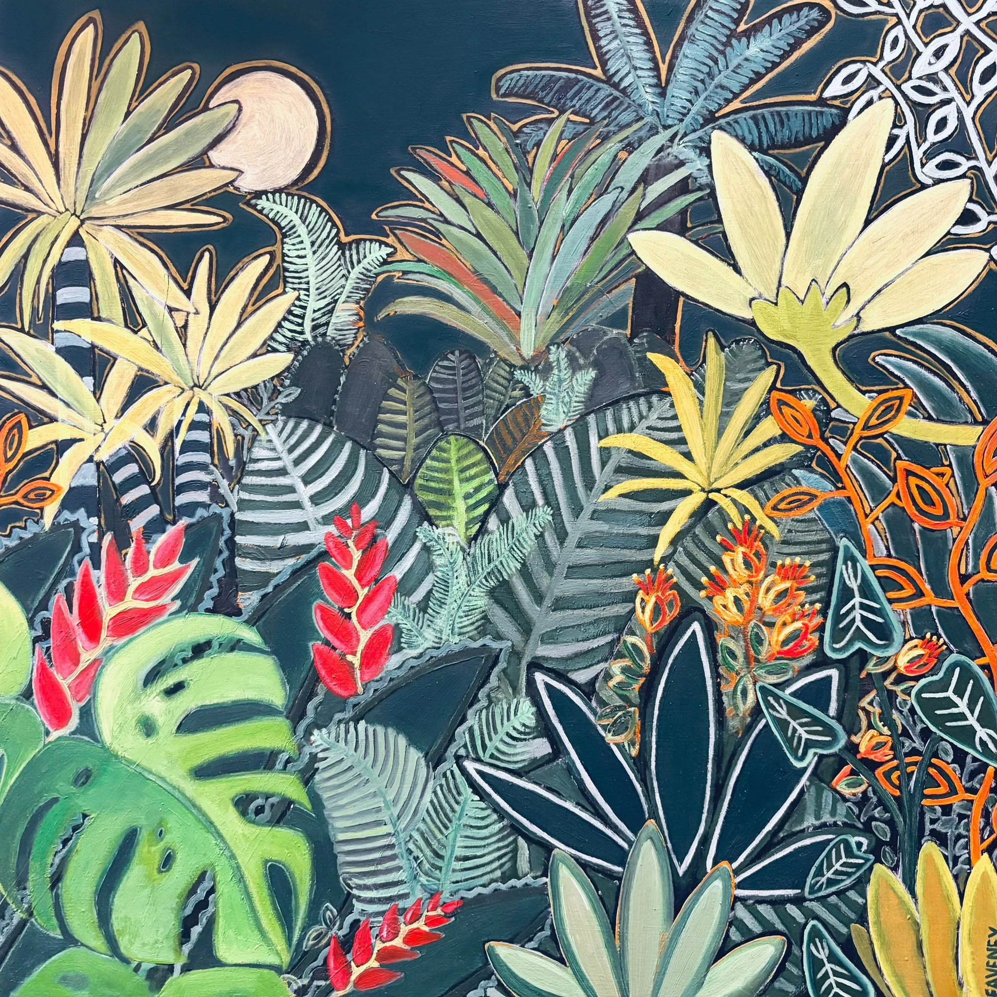 Midnight Canopy captures the lush vitality of the tropics under the quiet glow of the moon. Layered foliage and rhythmic patterns pulse with nocturnal energy, celebrating the wild abundance of nature. Illuminated leaves and vibrant blooms emerge from shadow, suggesting renewal and interconnection. The piece balances density with openness, evoking a sense of immersion and reverence - a reminder of the living pulse that continues beneath stillness and dark.