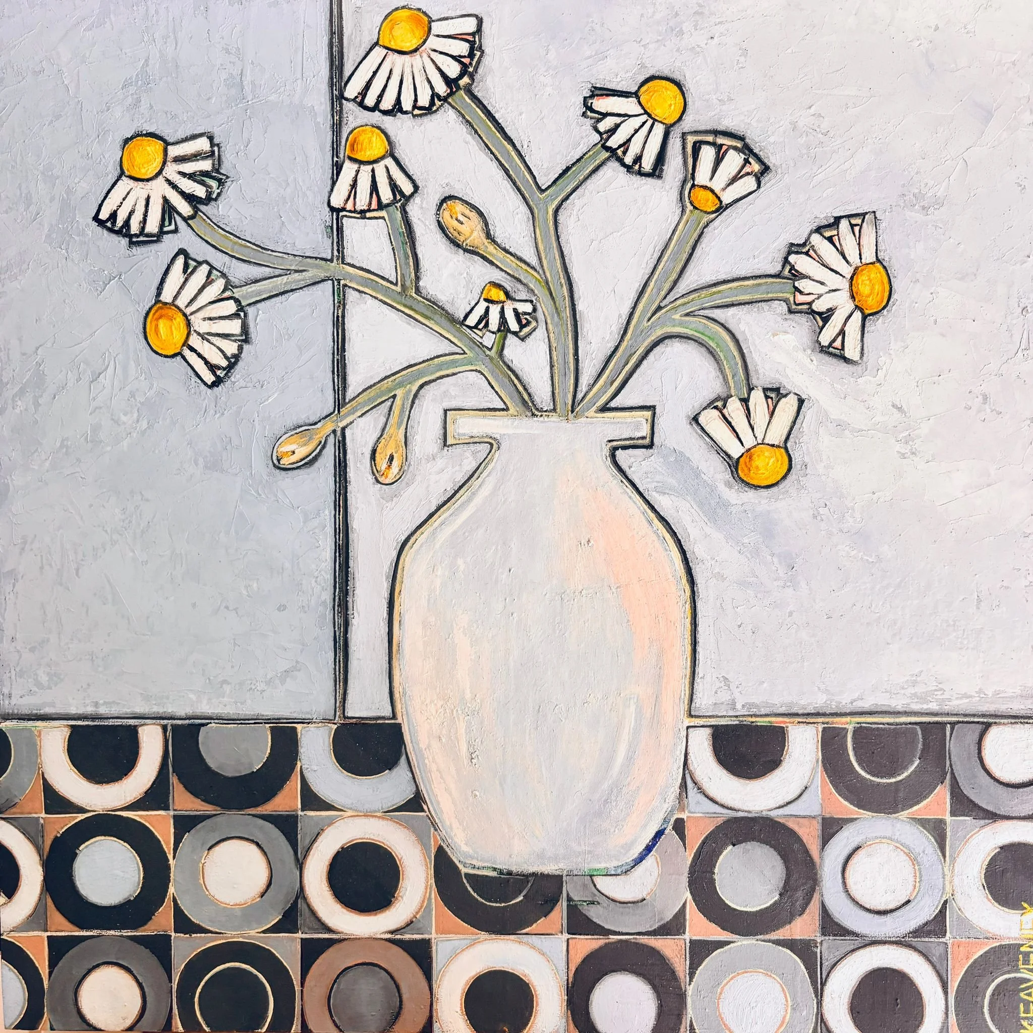 Pot of Daisies brings together stillness and play through a simplified arrangement of abstract daisies. Built with textured impasto layers, the surface holds visible brushwork and depth, giving the flowers a tactile presence. The pale palette and soft texture create a sense of calm, while the rhythmic tiled surface beneath the vase introduces structure and repetition. Gentle lines and muted tones allow the yellow centres to pulse with warmth, suggesting both fragility and joy. The piece reflects a quiet moment of observation; a pause to notice beauty in the everyday and the tender harmony between order and looseness.
